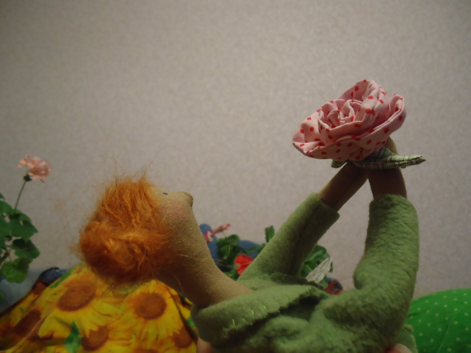 В руках у нее была огромная розовая мальва. Бог услышал ее молитвы. Девка то влюбилась наконец )))